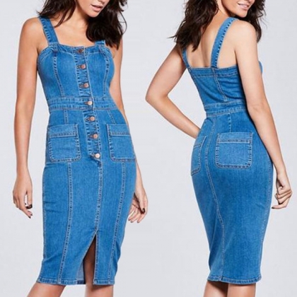 into this denim dress. Sling style,with backless,slit hem and a fit silhouette,this dress can showcase