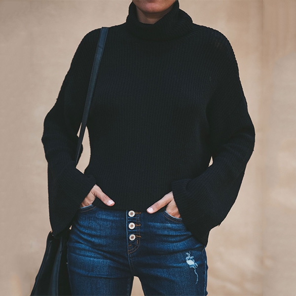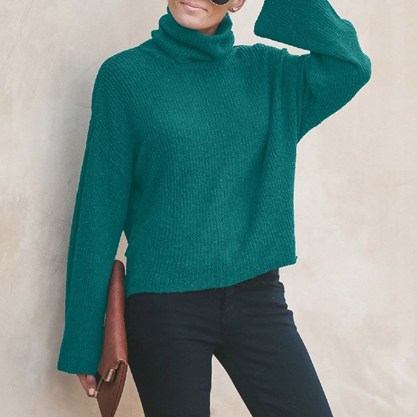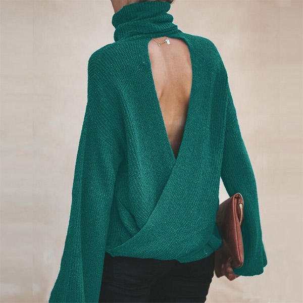 finished with trumpet sleeve,backless,turtleneck and a loose silhouette,this sweater can keep you warm while