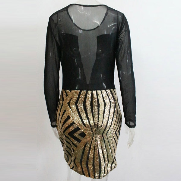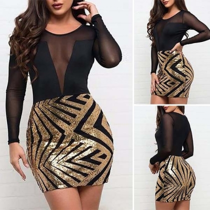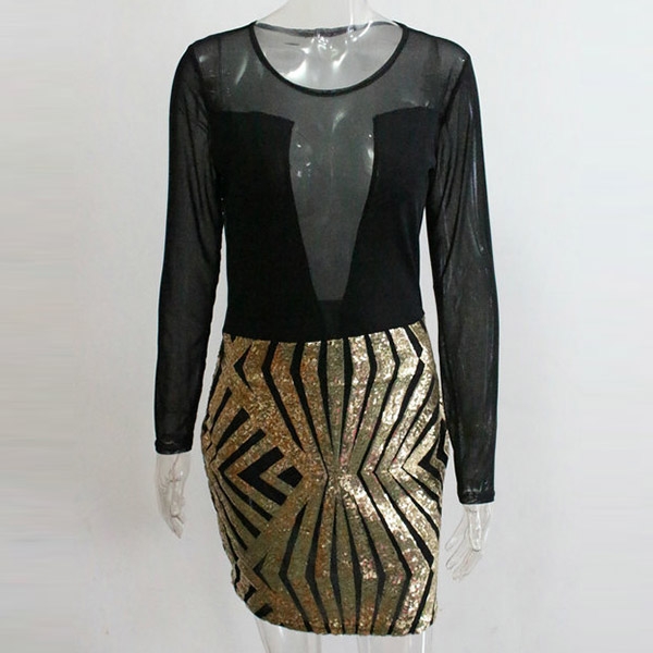 Sexy Contrast Color Round-neck Long Sleeve Gauze Spliced Paillette Dress