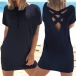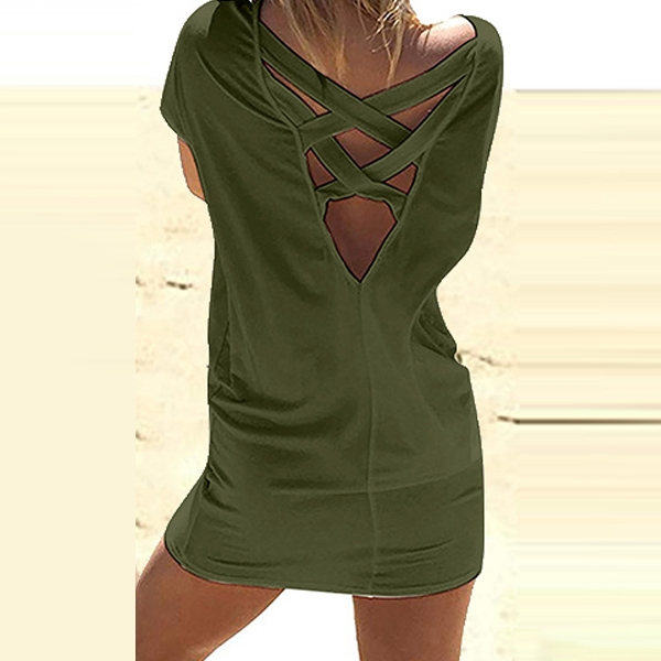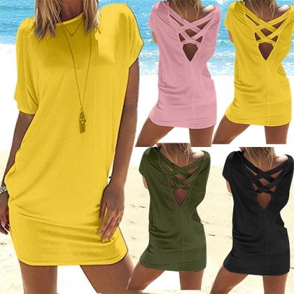 Sexy Solid Color Crossover Backless Short Sleeves T-shirt Dress(it falls short)