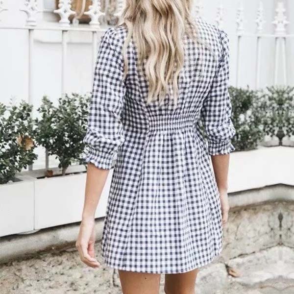 This dress is designed with plaid element,stylish and popular,while the 3/4 sleeve and deep v-neck