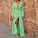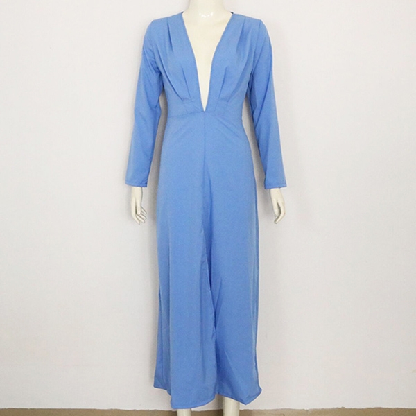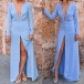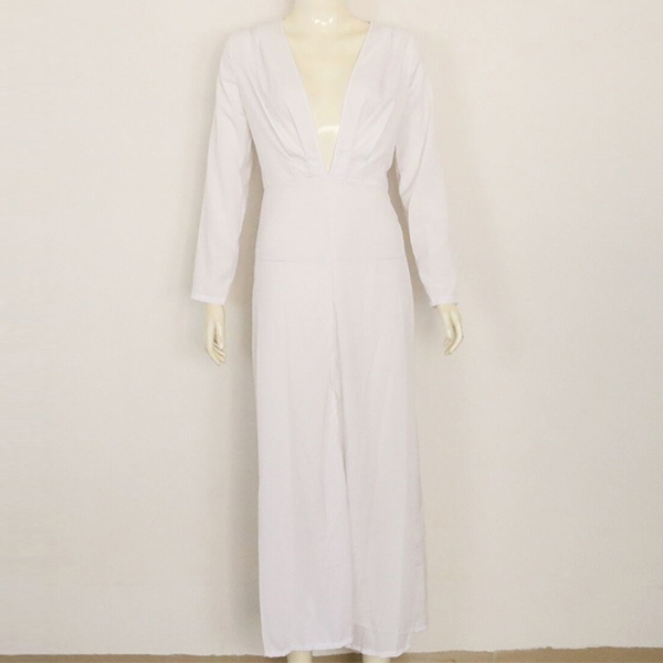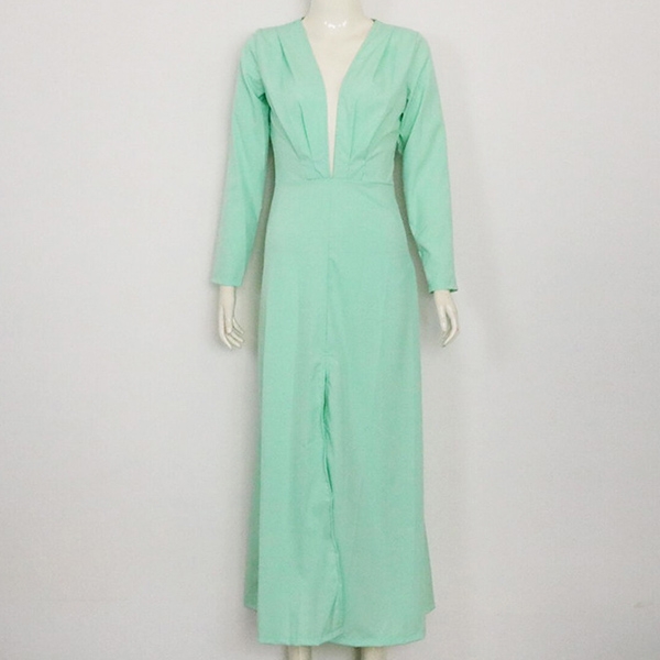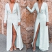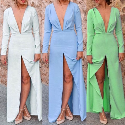 silhouette, outfit with a deep V-neckline, a high–slit dress hemline, long sleeves, this pieces