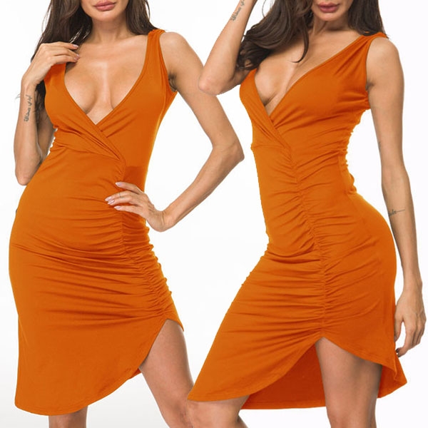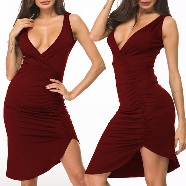 Sexy Deep V-neck Irregular Hem Sleeveless Slim Fit Dress