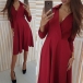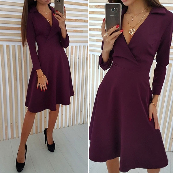 this delicate and elegant dress in your closet. It comes with a solid color,the deep v-neck design can