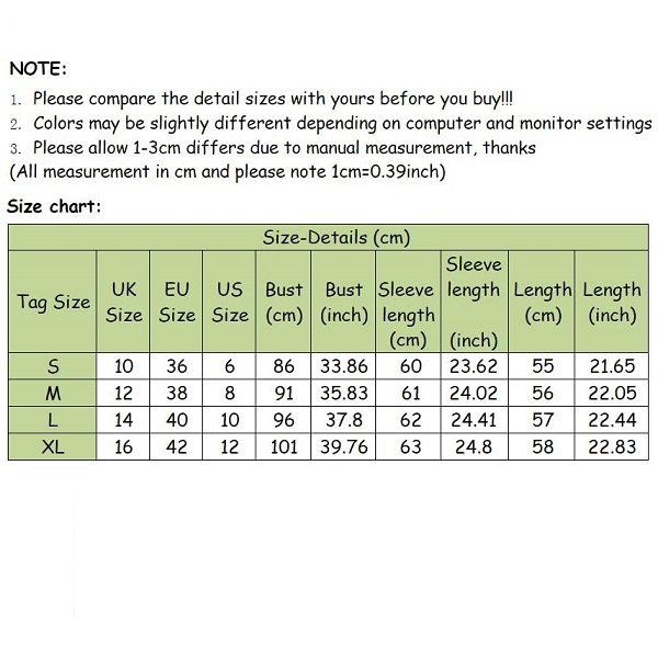 XL : Bust : 101cm(39.76"); Shoulder : 40cm(15.75"); Sleeve : 63cm(24.8"); Length : 58cm(22.83");