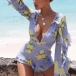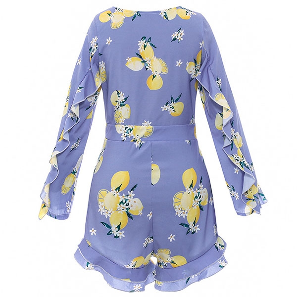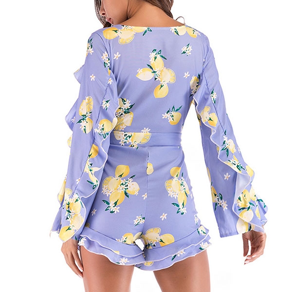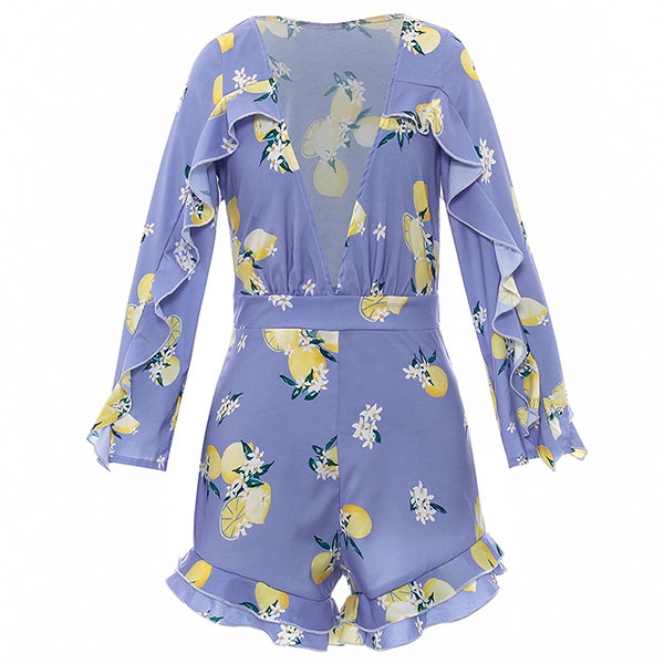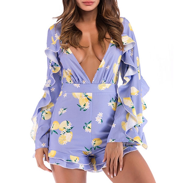 Sexy Deep V-neck Long Sleeve Slim Fit Ruffle Printed Romper