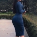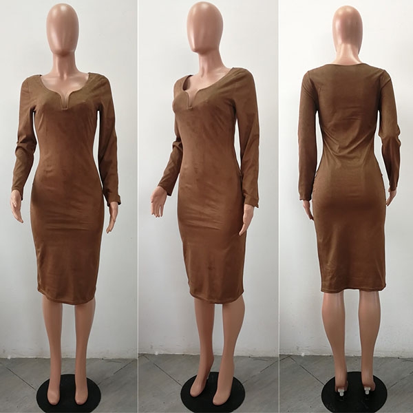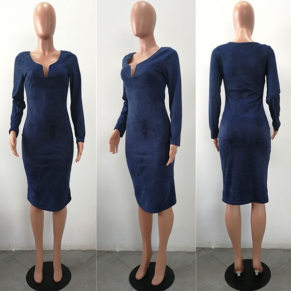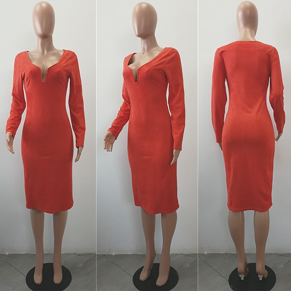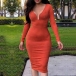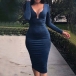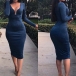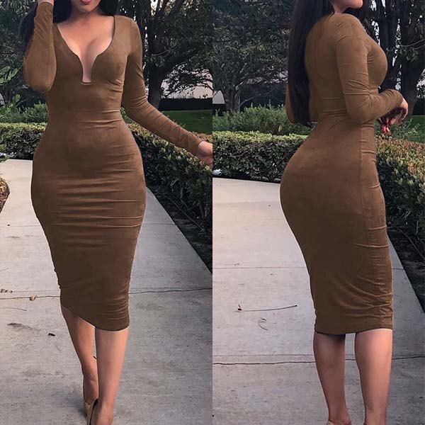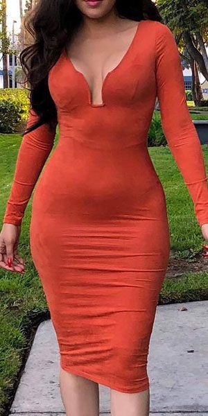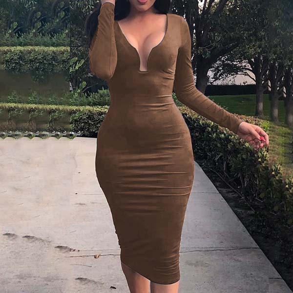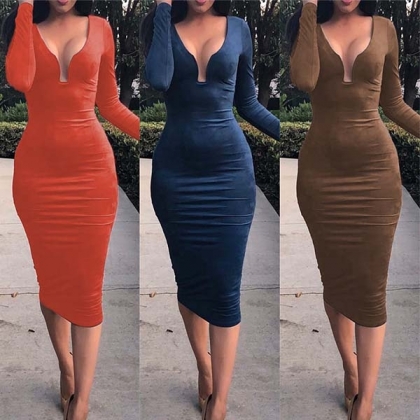 Sexy Deep V-neck Long Sleeve Solid Color Tight Dress