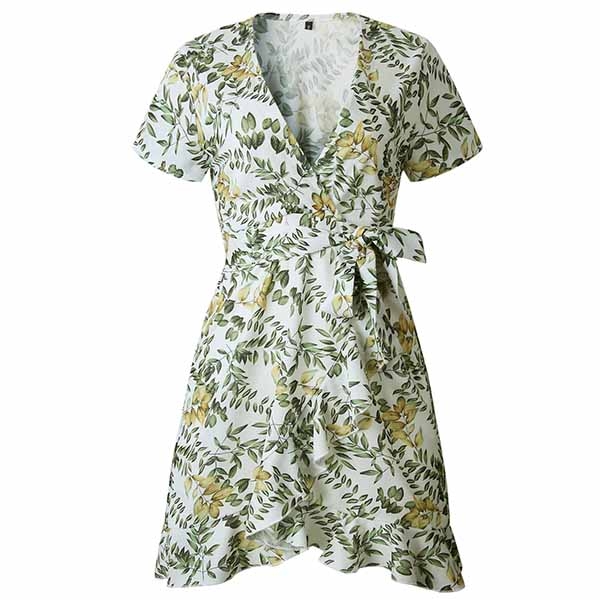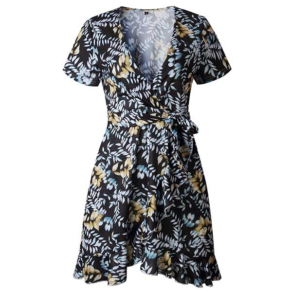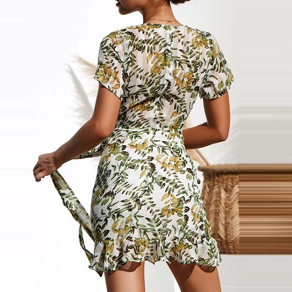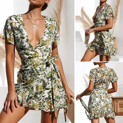 vibrant floral print,the deep v-neck and ruffle hem design will enhance your feminine appeal.