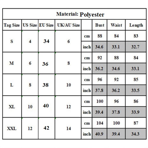 XL : Bust : 100cm(39.37"); Waist : 96cm(37.8"); Length : 86cm(33.86");