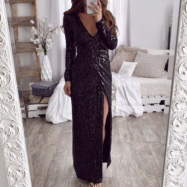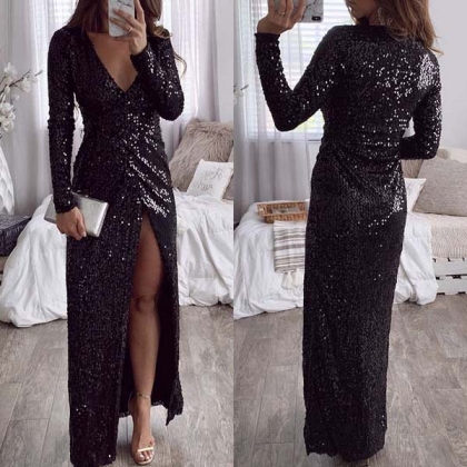 The deep v-neck and slit hem design make it look so sexy and alluring,while the sequin details
