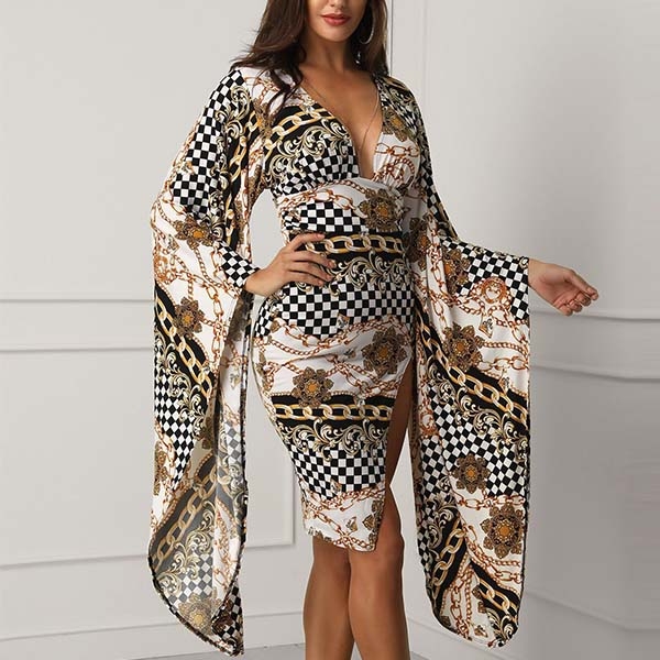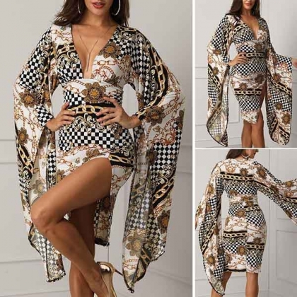 this piece look so eye-catching,while the deep v-neck,slit hem and unique trumpet sleeve design will make