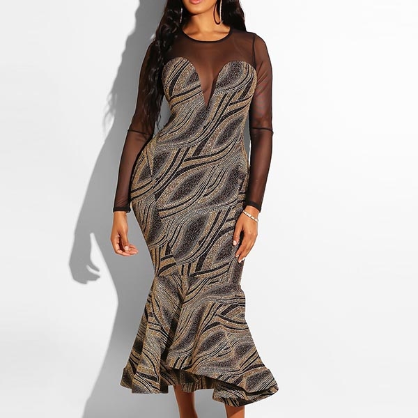 The see-through gauze spliced design will give you a more alluring look,while the fishtail hem design