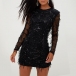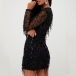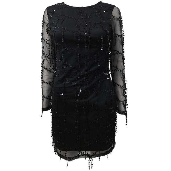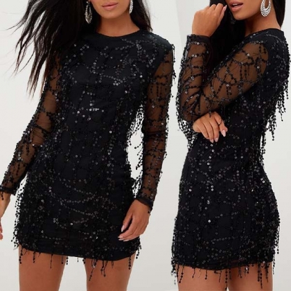 vi föreslår dig denna fantastiska klänning. Den genomskinliga gasväven skarvad lång ärm och paljett tofs design