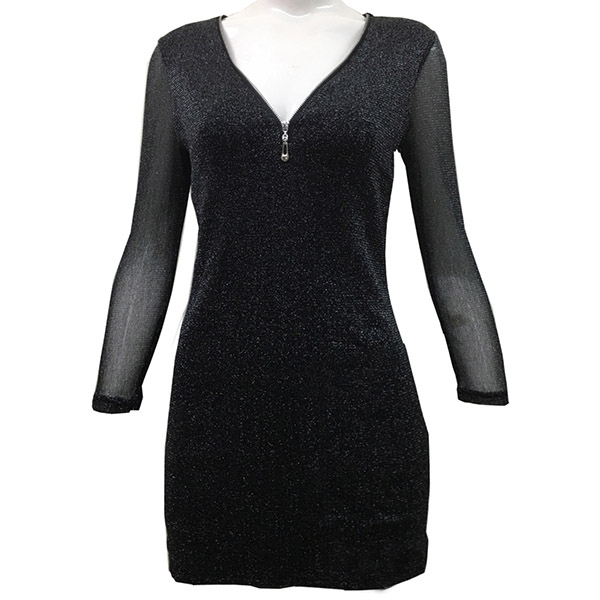 parties and gatherings. The gauze spliced long sleeve and zipper v-neck design make this piece