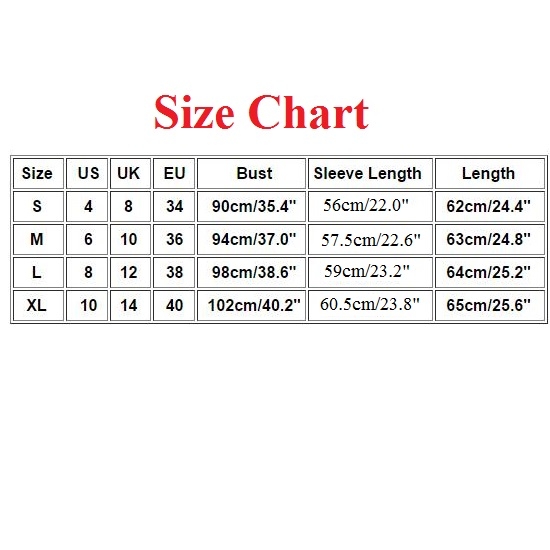 S : Bust : 90cm(35.43"); Shoulder : 40cm(15.75"); Sleeve : 56cm(22.05"); Length : 62cm(24.41");