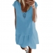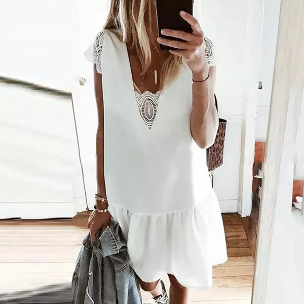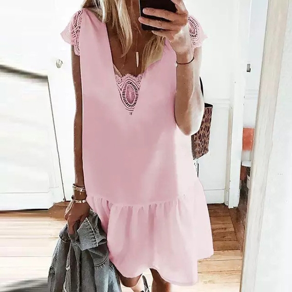 the short sleeve,v-neck,ruffle hem and lace spliced design will make this piece look more attractive.