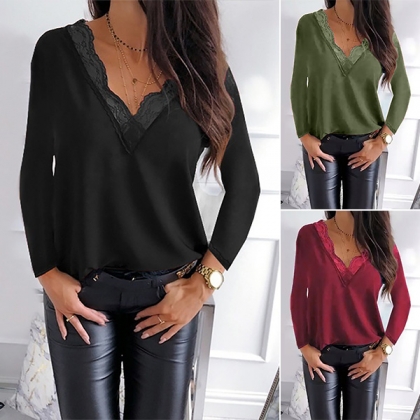 Sexy Lace Spliced V-neck Long Sleeve T-shirt