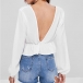 flirty and feminine look. This woven top featuring a plunging V-neck and back, long sleeve
