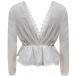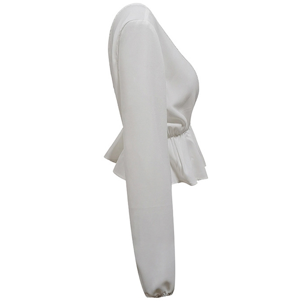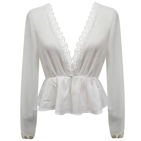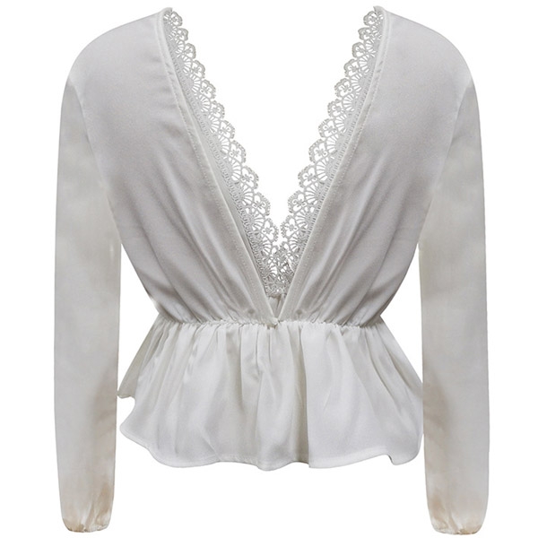 Sexy Lace Trim Deep V-neck Elastic Waist Long Sleeve Top