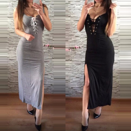 Solid color style,its lace-up deep v-neckline and slit hem design makes this dress look sexy and