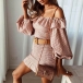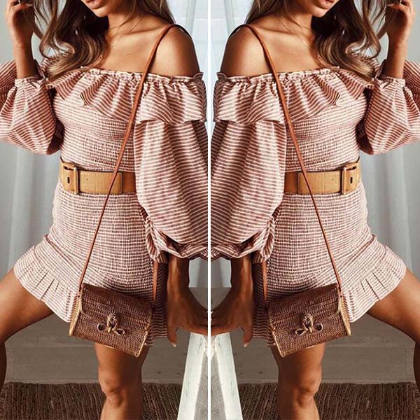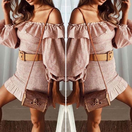 Designed with striped element,including a top and a skirt,the lantern sleeve,boat neck and ruffle design