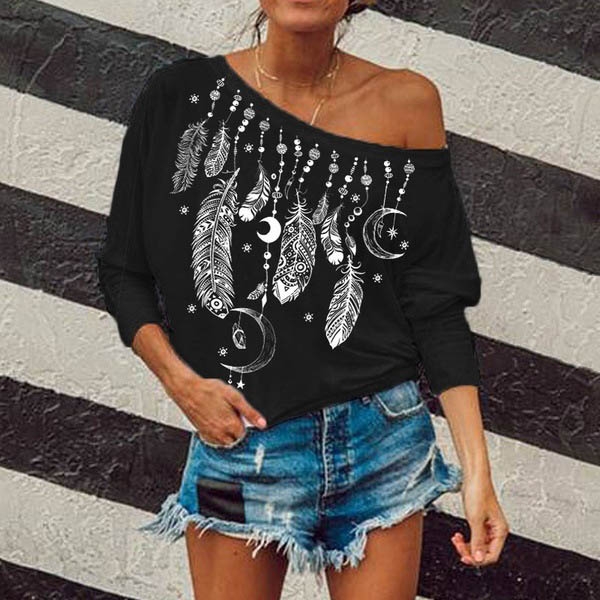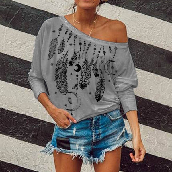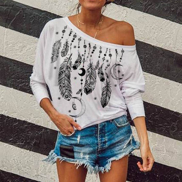 The oblique shoulder and feather printed pattern design are the highlight,while its soft and