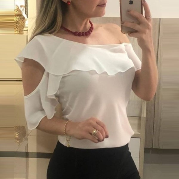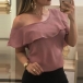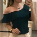 Sexy Oblique Shoulder Hollow Out Ruffle Solid Color Top