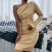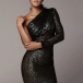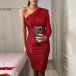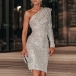 Sexig Paljettklänning med snedställd axel och långa ärmar