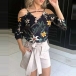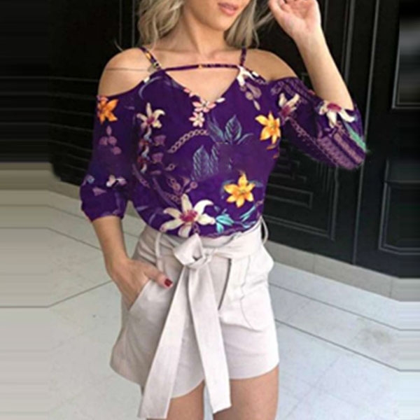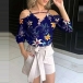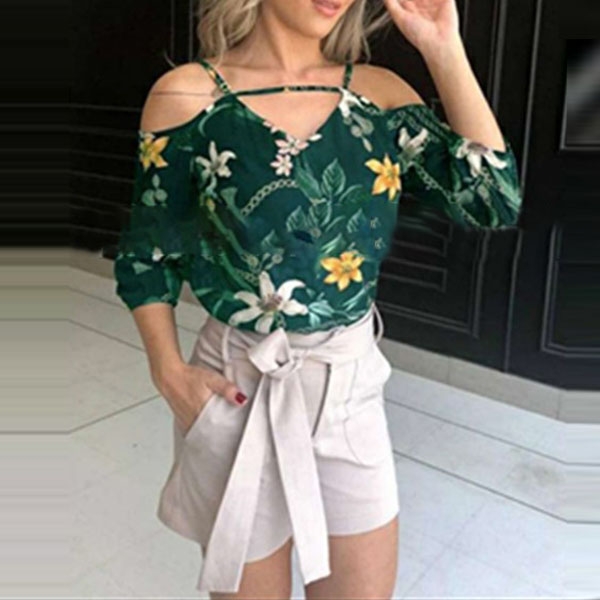 It features chic and eye-catching printed pattern,the off-shoulder,3/4 sleeve and v-neck