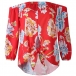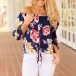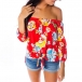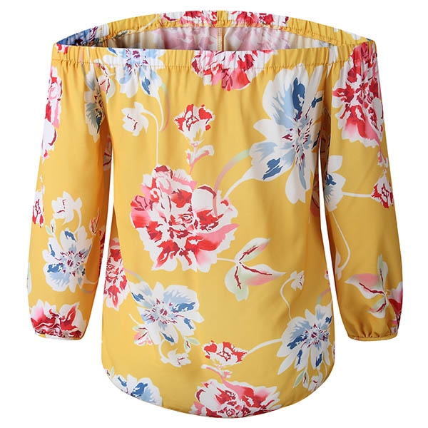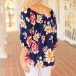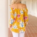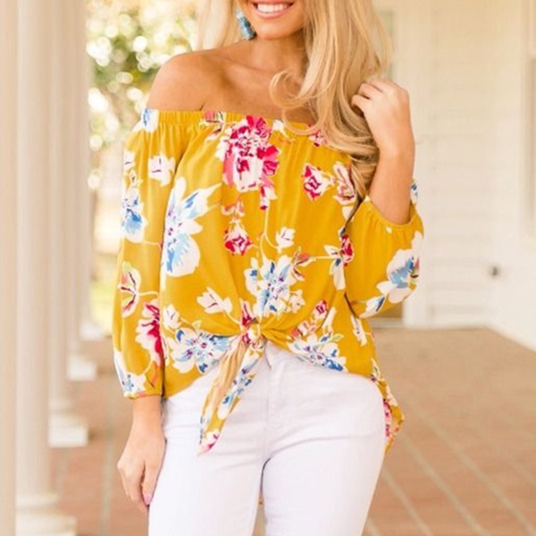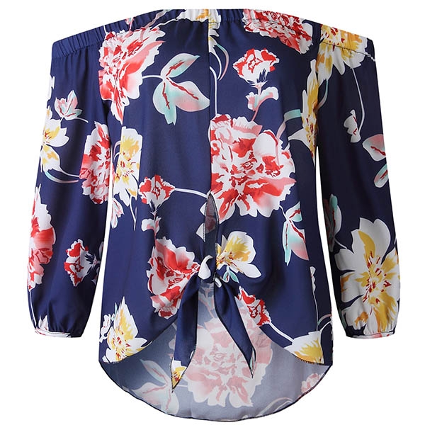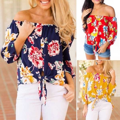 vibrant floral print,finished with 3/4 sleeve,off-shoulder boat neck and knotted hem design,