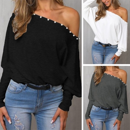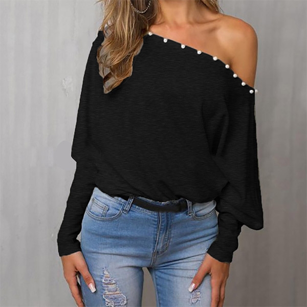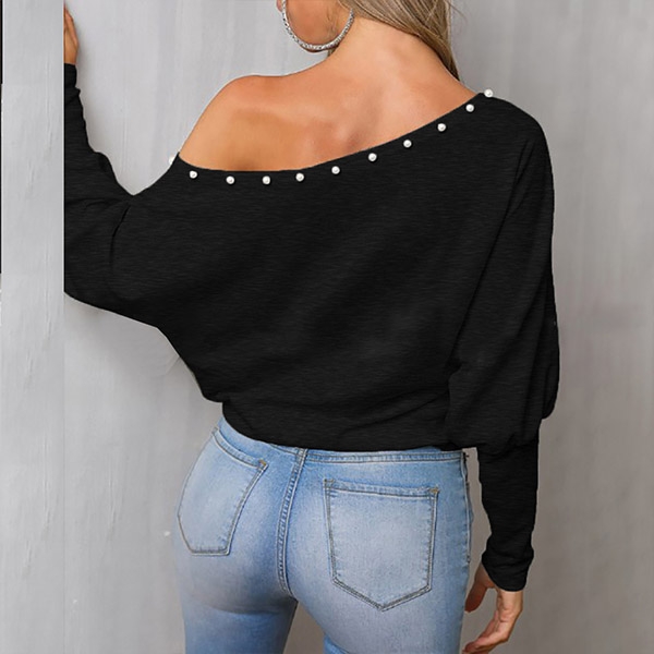 the dolman sleeve and boat neck with pearl details will make this piece look more attractive