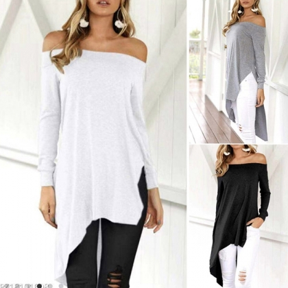 Sexy Off-shoulder Boat Neck Long Sleeve Irregular Hem Top