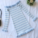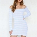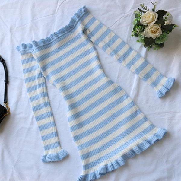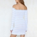 Designed with striped element,the off-shoulder boat neck and ruffle design will give you a more charming look.