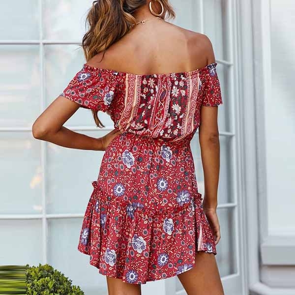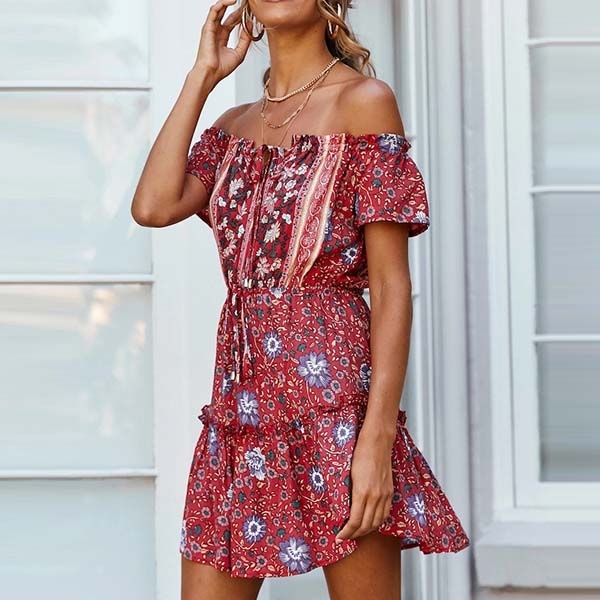 Boasts vibrant floral print,the off--shoulder boat neck design will lend you a dash of sexy