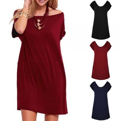 Sexy Off-shoulder Boat Neck Short Sleeve Solid Color Dress
