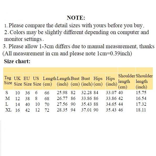 XL : Bust : 94cm(37.01"); Hips : 92cm(36.22"); Shoulder : 46cm(18.11"); Length : 72cm(28.35");