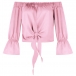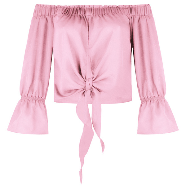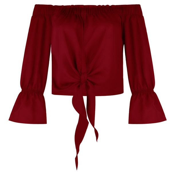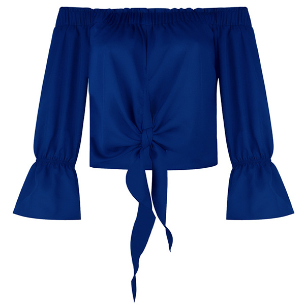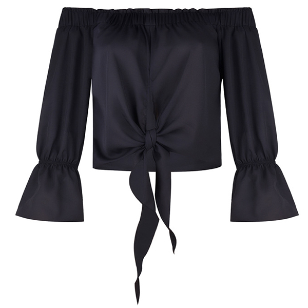its distinctive design details like off-shoulder boat neck,trumpet sleeve and knotted hem design make this piece