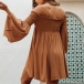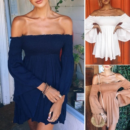 Comes with a solid color,the off-shoulder boat neck and trumpet sleeve design are the highlights,which can offer