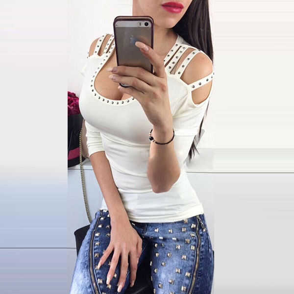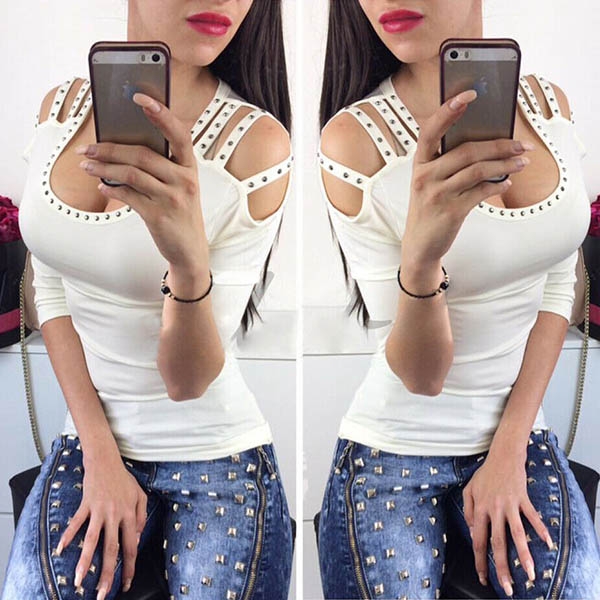 It is finished with off-shoulder,half sleeve,u-neck and rivets details,retro,chic and sexy.