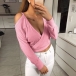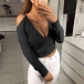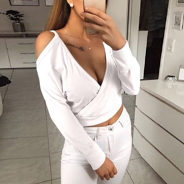 Sexy Off-shoulder Long Sleeve Deep V-neck Solid Color Top