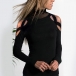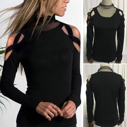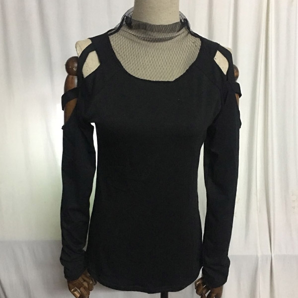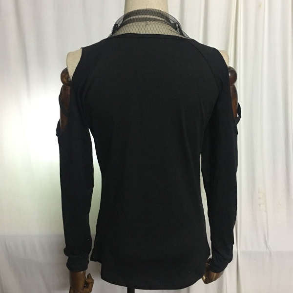 This t-shirt comes with a classic,stylish yet flattering black tone,the off-shoulder and gauze splice mock