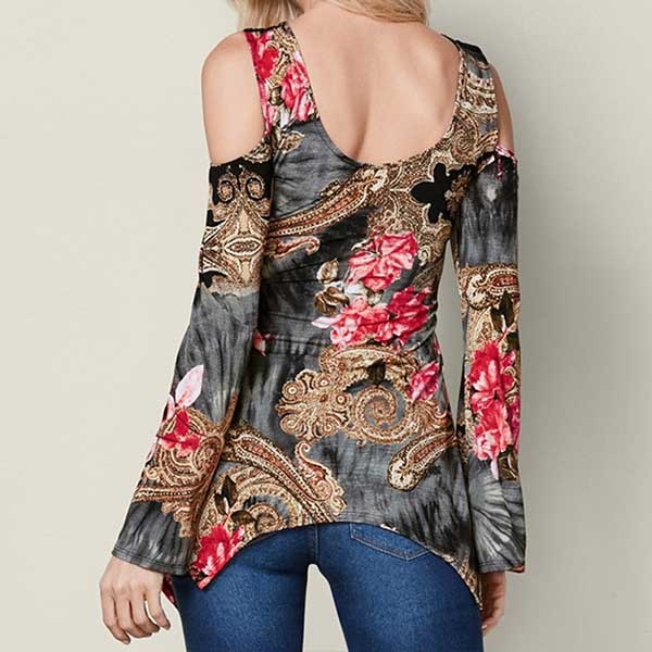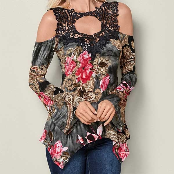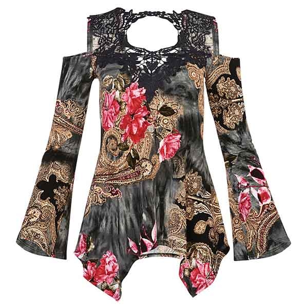 and eye-catching printed details,the off-shoulder,irregular hem and lace spliced design will make this piece