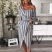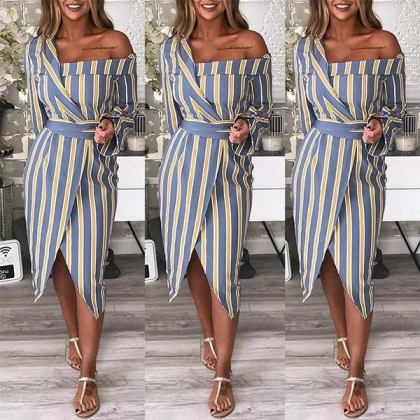and weekend gatherings. Striped style,the off-shoulder and irregular hem design make this piece look so