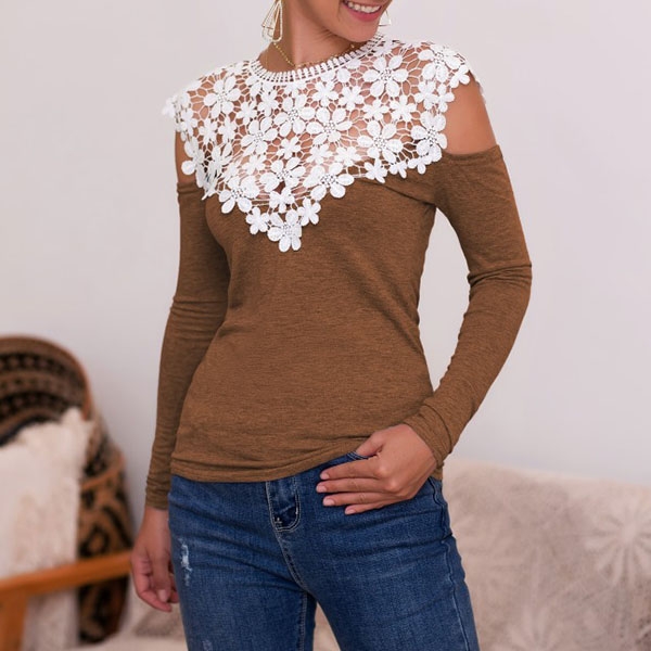 Enhance your feminine appeal with the help of this t-shirt. The off-shoulder and lace spliced