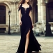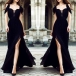 Designed with a mysterious and flattering black tone,the off-shoulder,square collar and slit