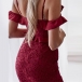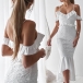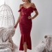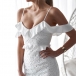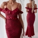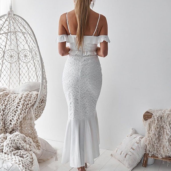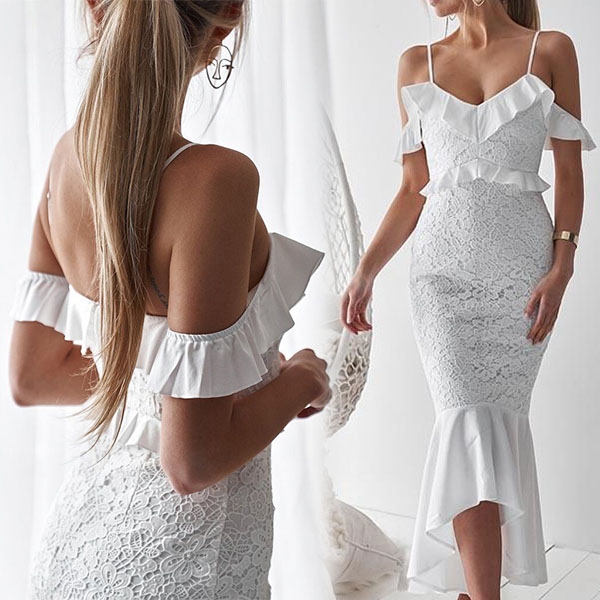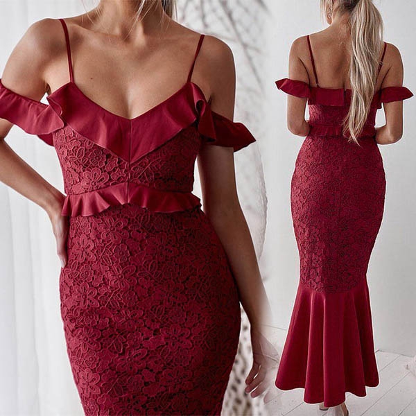 details like off-shoulder,v-neck,fishtail hem and lace spliced design make this piece look so sexy and sultry.