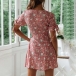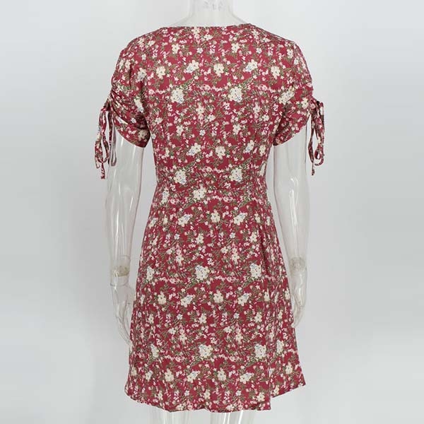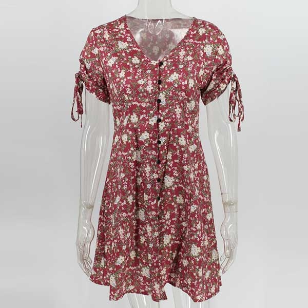This dress boasts vibrant floral print details,with short sleeve,v-neck and front button design,