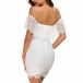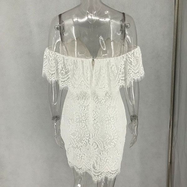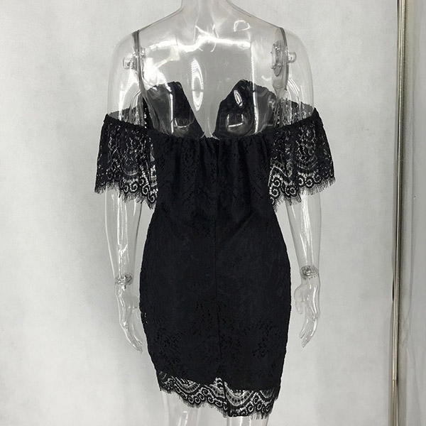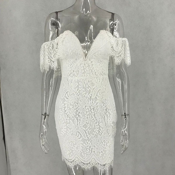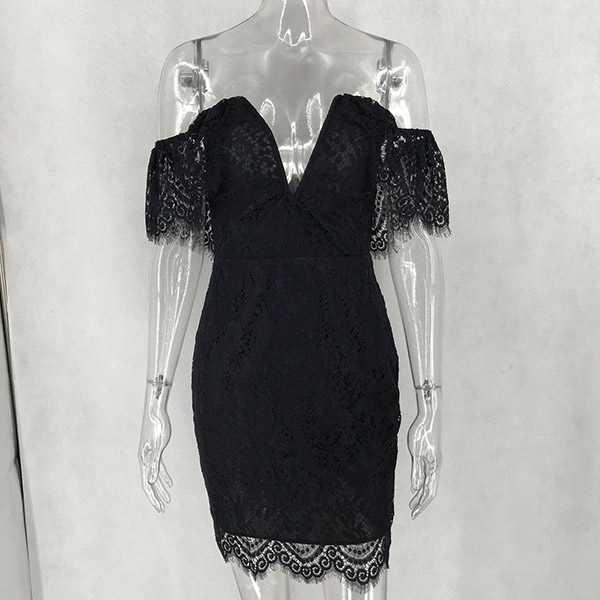 Create a sassy look with the flirty details of this lace dress. The off-shoulder and v-neck design