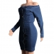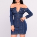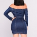 breaking the classic denim dress’s monotonous design, add to off-the-shoulder neckline to showcase