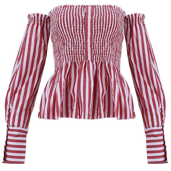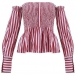 and stretchy fabric, featuring with an allover stripe print, a ruffled off-the-shoulder neckline, a long sleeve,